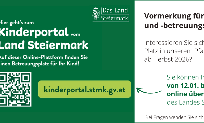 Die Vormerkung für das Kinderbildungs- und -betreuungsjahr 2026/ 2027 im Zeitraum von 12.01. bis 08.02.2026 über das Kinderportal des Land Steiermarks möglich.