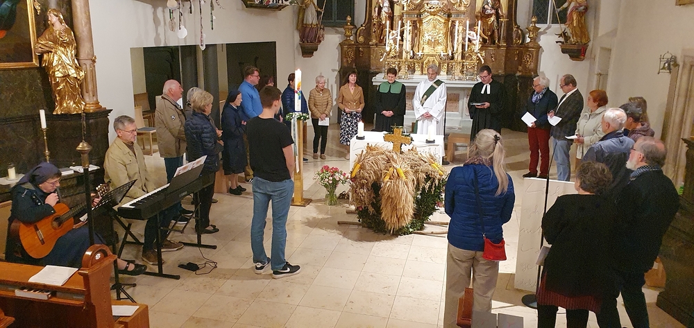 Von der schwungvollen Musik unserer Musikgruppe begeistert, sangen wirklich alle gerne mit, vom  Kirchenchor bis zu den VS-Kindern, deren besonderer Erntedankschmuck übrigens nun die Empore im Altarraum ziert.