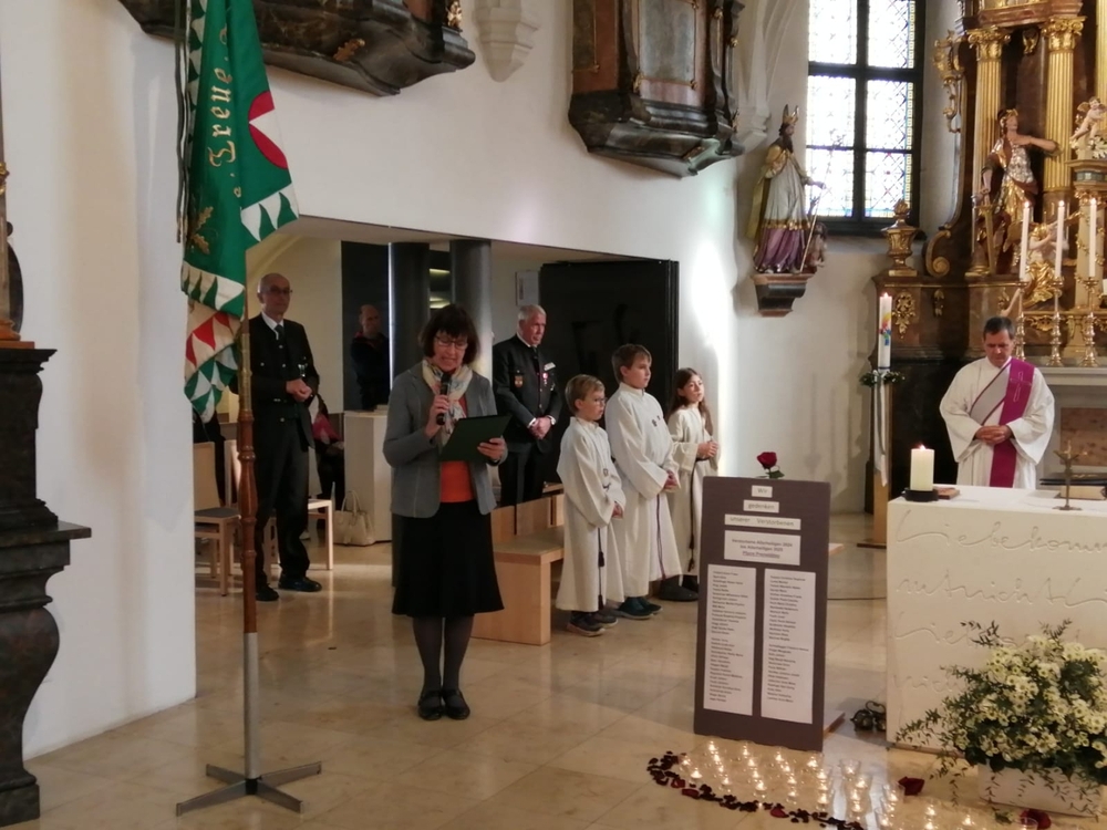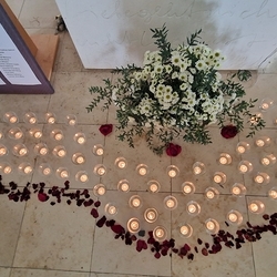 Vor dem Altar brannten 59 Teelichter für alle Menschen, die im letzten Jahr in unserer Pfarre verstorben sind. Ihre Namen wurden noch einmal laut ausgesprochen. Ein Teelicht leuchtete für alle Verstorbenen, die ungenannt blieben.