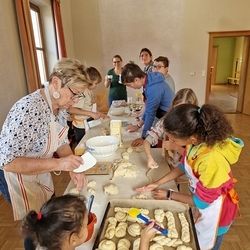 Dank Elena im Kindergarten Premstätten hatten sie neben dem Herd im Pfarrhof auch noch zwei weitere Herde in Verwendung, um die große Menge an geformten Teiglingen zu Köstlichkeiten zu verwandeln.