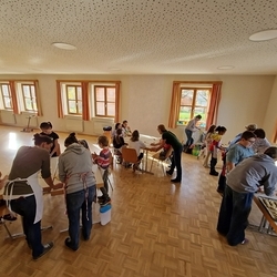 Am 31. Oktober fanden sich auch heuer wieder viele große und kleine Bäckerinnen und Bäcker im Pfarrheim ein, um aus 12 kg Germteig herrliche Allerheiligenstriezerl zu formen. Sieben Erwachsene sowie alle Minis und eventuell zukünftige Minis (insgesamt 16 Kinder) waren von 9 -11 Uhr mit Feuereifer dabei.